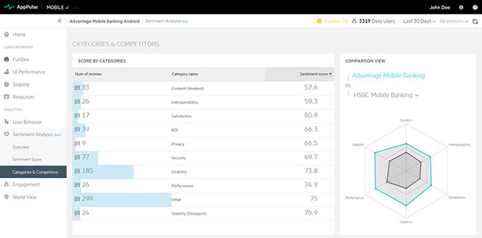 Now you can take the next step and analyze your app ratings and reviews using Sentiment Analysis. AppPulse Mobile Sentiment Analysis reports shows you what your users think about your app in several categories (performance, security, ROI, and more) by analyzing your users’ reviews and providing an easy to read scoreboard.