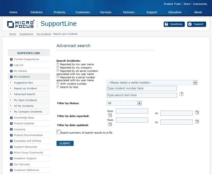 Need to perform a more advanced search or create a report detailing your Support Incidents? Just use the Advanced Search feature. Simply enter the parameters for your search and click 'Submit'.