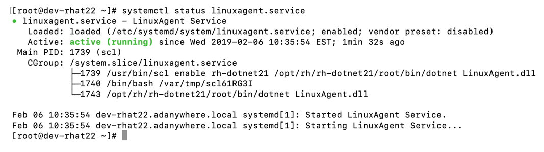 During the installation, the Linux Agent is added by default to the Computers OU in Active Directory. After the installation is complete, the Linux Agent service runs on the Linux system, as demonstrated in the example below of an installation on a Red Hat distribution.