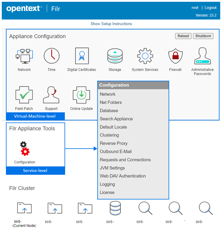 You and those with the vaadmin or root user password use this to manage virtual-machine-level settings and Filr service configurations that affect an entire service and its interactions with other services.