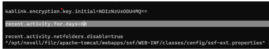 By default, if any activity like adding comments, move, copy, or share performed by users on the files in My Files, Shared with Me, and Net Folders area are listed in the Recent files. However, the Filr administrator based on the activities can restrict the files from the Netfolder getting displayed in Recent Files. To restrict the files, add recent.activity.netfolders.disable=true as a separate line at /opt/novell/filr/apache-tomcat/webapps/ssf/WEB-INF/classes/config/ssf-ext.properties, as shown in the figure below and restart the Filr Service.