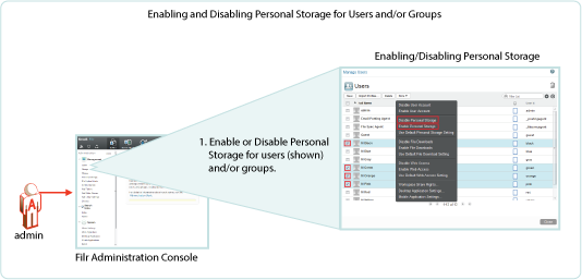 After enabling personal storage for everyone, you can then use the Users > More and/or Groups > More menu to disable or modify personal storage settings for individual users and/or groups.