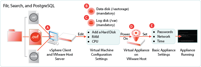 NOTE:The information in this section illustrates a VMware deployment. The same basic steps apply to other supported hypervisors. For specific deployment instructions, refer to the OpenText Filr 23.3: Installation, Deployment, and Upgrade Guide.