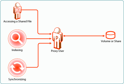 Net Folder proxy users provide Net Folder access for three Filr functions: file sharing, indexing, and synchronization, as illustrated in Figure 10-6.