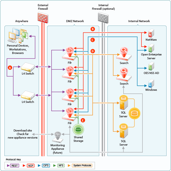 The components in a Filr deployment use a number of different protocols to communicate and provide Filr services, as shown in Figure 11-1. The optional internal firewall is shown to facilitate the illustration of a separate (and also optional) DMZ network.