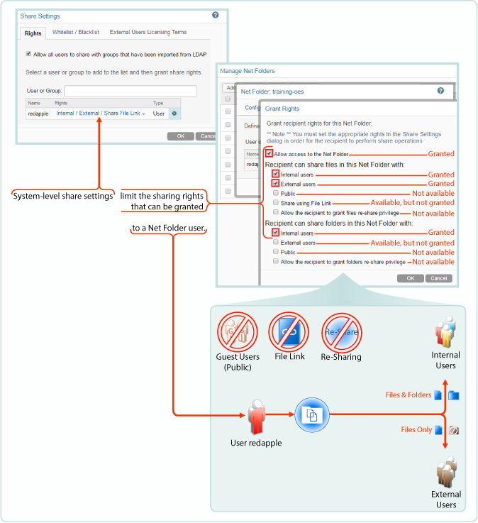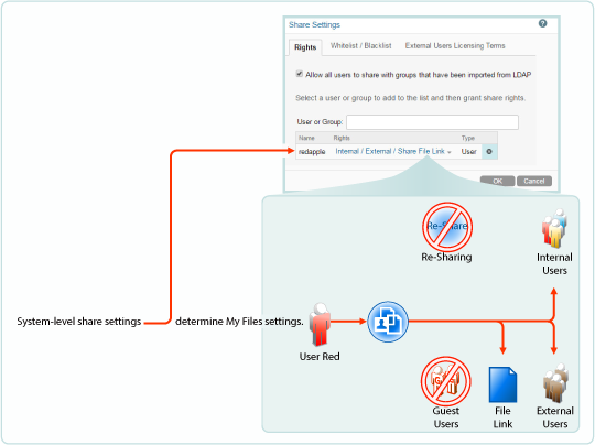 In Figure 12-4, user red can only be assigned sharing rights that are allowed at the system level.