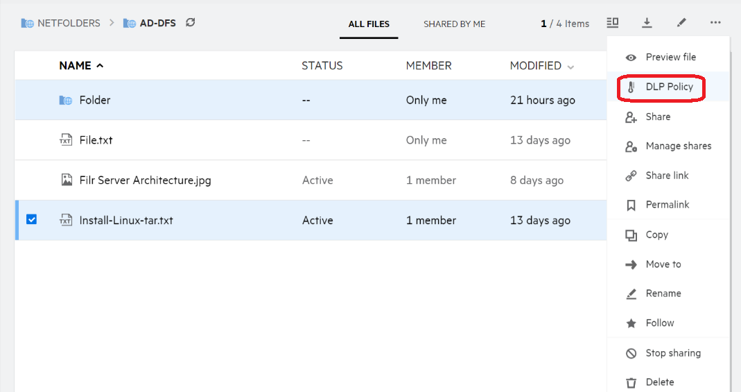 If you are made a Moderator to a netfolder, you can apply DLP policy to files in that netfolder.