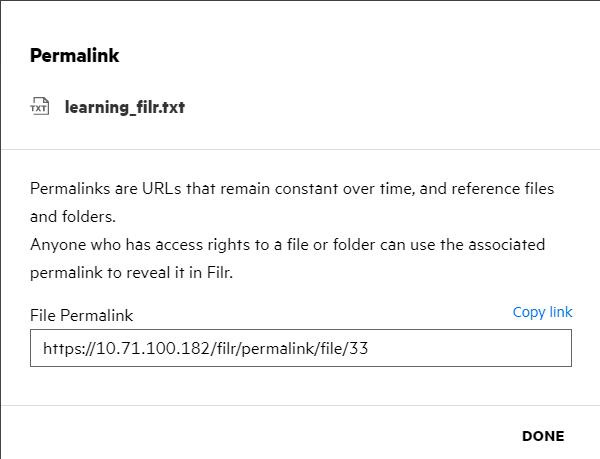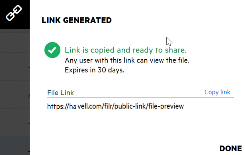 The link is generated and automatically copied to your clipboard. You can now share the link directly with anyone through email, text messages, social media, or any other collaboration forum. Any user clicking on the link will get direct access to the file. Based on the type of link, users will be able to view or download the file.