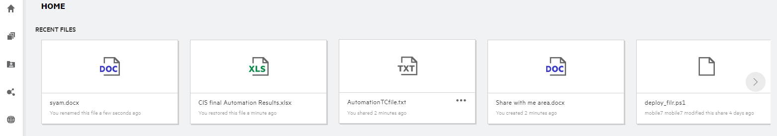 In the Recent Files, the logged-in user can see the recent files accessed. When the file is shared, only the file owner and the recipient can see the files in the Recent List. For example, User A (owner) shares a file with user B. The file is displayed in user A and user B’s Recent Files list. After a few days, if the same file is shared by user A to user C, the shared file is displayed on user A and C’s Recent Files list.