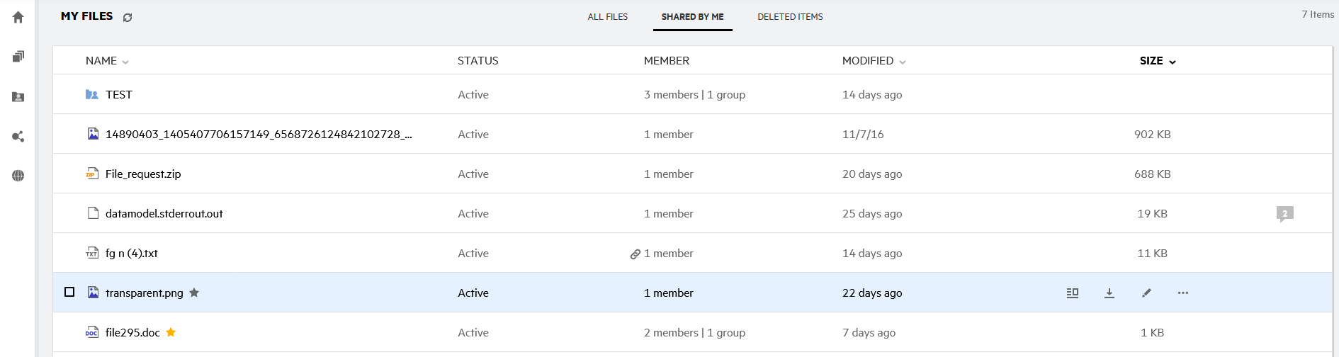 On sharing a file, the Members column in the My Files area gets updated with the count of members or groups the file is shared with. All the files you share are also listed under SHARED BY ME in their respective areas. If any files are shared with you, those files are listed inside SHARED WITH ME area. You can also click the