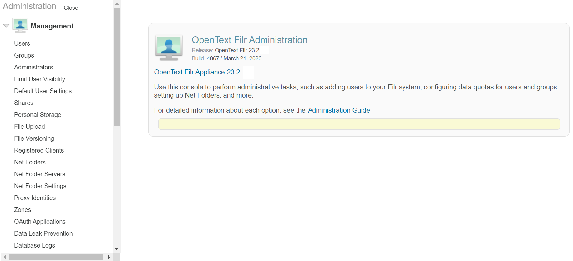NOTE:The Administration Console can only be accessed through the New Filr Web client by the Administrators and admin equivalent users.