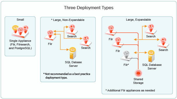 Single-Appliance, Large, Expandable Deployments: If you want to start small, you can create a single-Filr-appliance deployment with one or two Filrsearch appliances, an SQL database connection, and a shared NFS or CIFS disk (for /vashare).