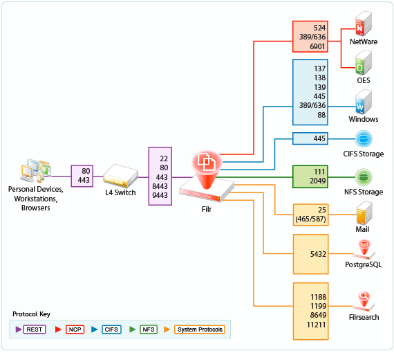 Figure 2-14 illustrates the ports that can be used in Filr deployments, including insecure ports. For information on configuring and securing Filr securely, see DMZ Setup for Filr