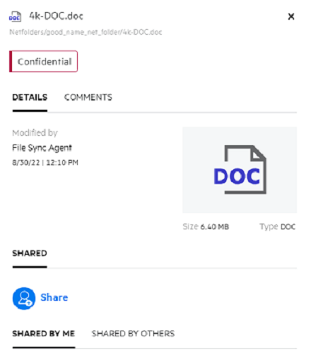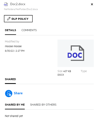 If the DLP is enabled and a policy is applied at the netfolder level, the DLP policy name will appear above the Details tab. The policy name is read-only and non editable.