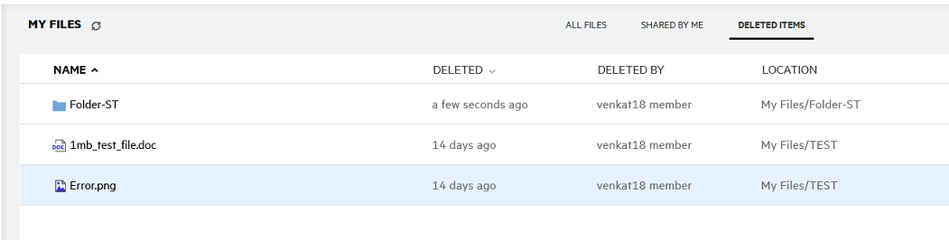 Lists the files or folders that are deleted by you. Filr enables you to retrieve files and folders from the trash and restore them to their previous location. When you restore a file, all associated comments are also restored.