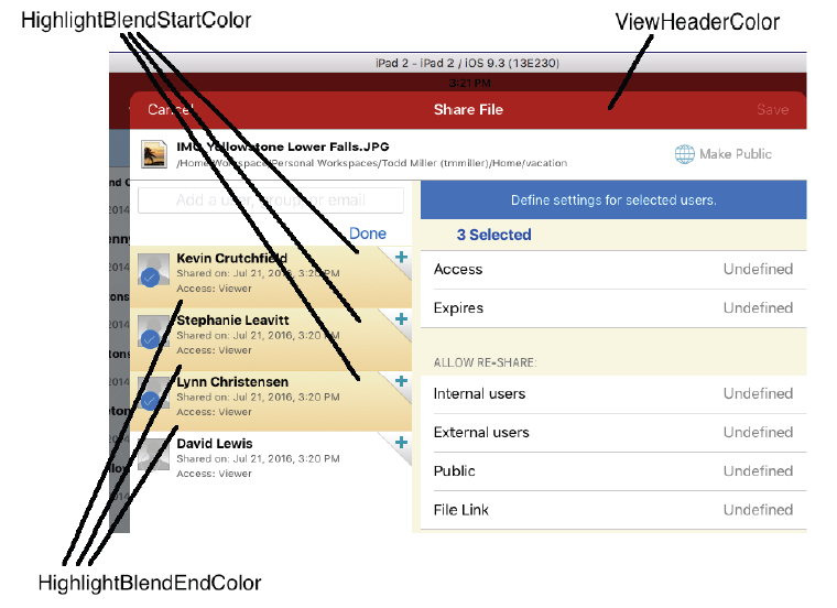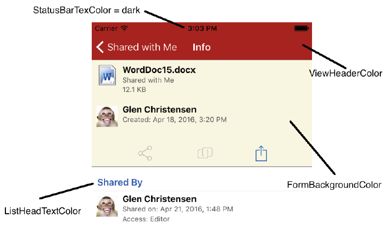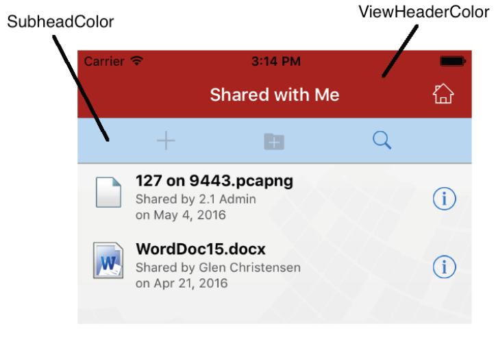 To apply custom branding to the iOS client, you create the image files for the dialogs you want to brand and define banner and other colors, as follows: