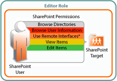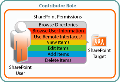 To perform contributor functions, users must have the Add Items and Delete Items permissions in addition to all of the permissions required for the Viewer and Editor roles. |
