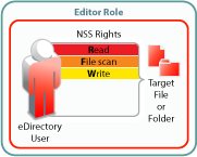 To modify file content through Filr, eDirectory users must have the Write file system trustee right in addition to Read and File Scan. |