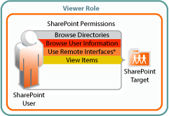 To view files and folders in SharePoint document libraries, SharePoint users must have the Browse Directories, Browse User Information, Use Remote Interfaces*, and View Items permissions in the document libraries. |