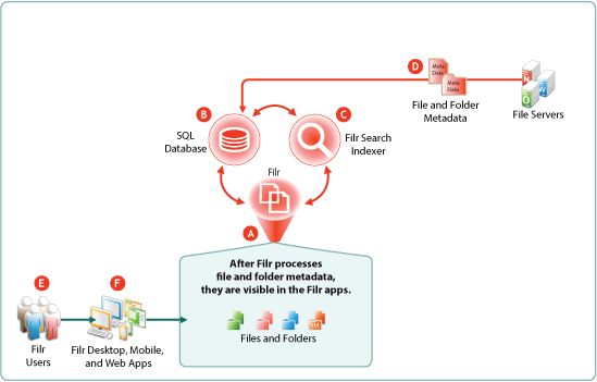 After the metadata is processed for users, files and so on, Filr users can see the objects in the Filr apps (Letter F).