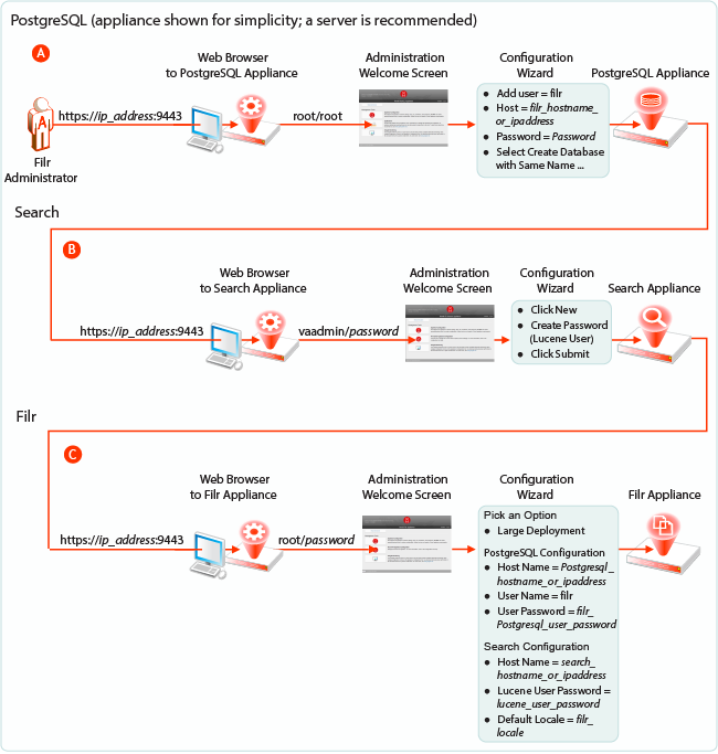 Starting and configuring the appliances for a large deployment is more involved than for a single appliance. However, the process is well documented and also very straightforward, as illustrated in Figure 2-10 and explained in the table that follows it.