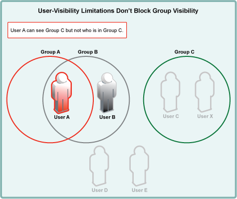 For example, after a user-visibility limitation is applied to Group A, User A can only see User B. (User B’s ability to see other users is not affected because User B is not in Group A.)