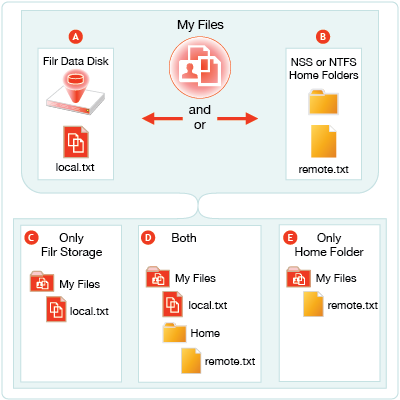 If you have enabled personal storage for users, and those users also have home directories associated with them in the identity store, they see what is stored in the Filr data store and a folder named Home under My Files. The Home folder provides a distinction between files and folders in the Filr data store and those in Home directories on the file server. |