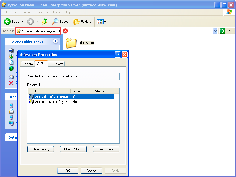 This procedure of settings the DFS referral can be used even if there are multiple domain controllers in a domain. However, while setting the DFS referral, you must ensure that you do not specify the fully qualified domain name of the domain controller in the file explorer to browse the SYSVOL folder. For instance, for a domain named dsfw.com that has multiple domain controllers nmfadc.dsfw.com and nmfrd.dsfw.com, you must specify \\dsfw.com\sysvol in the file explorer for setting the DFS referral as shown in the figure below.