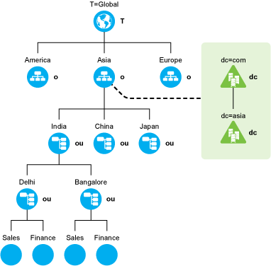 Name-Mapped Installation: Installing DSfW in a name-mapped setup means you are installing DSfW in an existing eDirectory tree inside a specific container. Before you install DSfW in an existing container, the container must be partitioned. In Figure 5-1 the existing container Asia is mapped to create a DSfW forest. After the mapping, all of the containers below the O= Asia container become part of the DSfW forest. If you have mapped an existing container to a domain, you cannot map the sibling containers to create a domain. Using the example in Figure 5-1, if you have already mapped the O=Asia container, you cannot map the O=America or O=Europe containers. However, this restriction is applicable only for the first domain or FRD in a forest. On the other hand, it is possible to map the containers underneath O=Asia to a domain. It is not possible to map the tree root partition to create a DSfW forest.