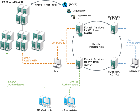 Within the authentication/authorization boundary (realm) established by DSfW, eDirectory replication can be used to expand the scope of users and groups that can access resources in a cross-domain and cross-forest scenario. In the example scenario shown above, users created in eDirectory 8.8 SP2 and above are replicated into the DSfW domain and can therefore access servers in the Active Directory forest.