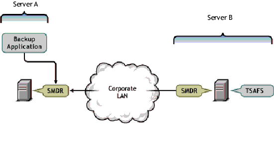 In Figure 7-1, SMDR running on Server A behaves as a client that services requests for backup application and for TSAFS running on the remote Server B. SMDR on Server B behaves as a server to SMDR running on Server A.