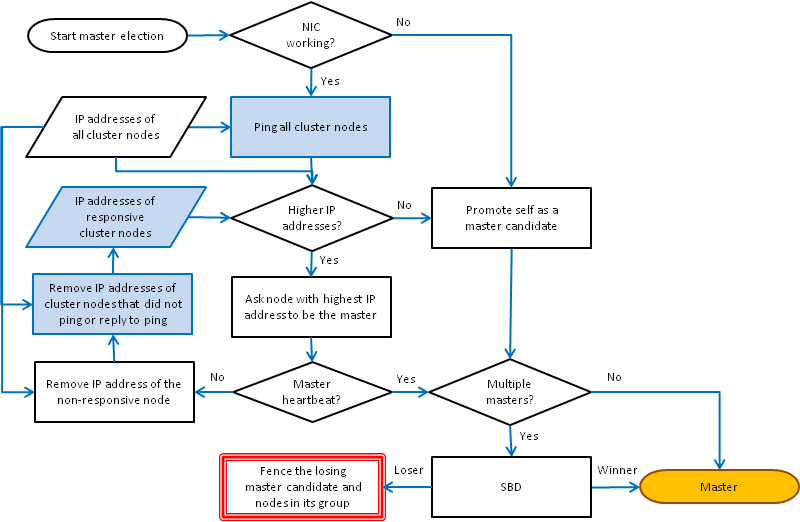 If more than one node is elected as master at the end of the process, the SBD guarantees that only one master survives and fences the other masters and their members.