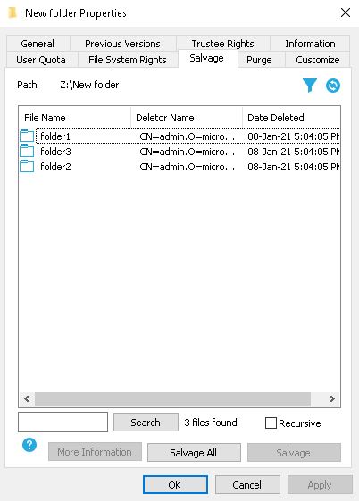 NOTE:To salvage the deleted files from a sub-directory, ensure to salvage the sub-directory and then salvage the files in the sub-directory.