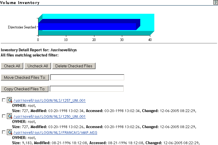 After generating an inventory report for a volume or directory, you can create a customized scan to report more specific information and perform additional actions on the files such as move, copy, or delete files selected in the report.