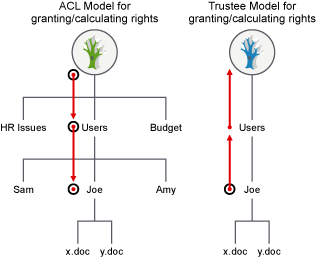 The Storage Services (NSS) volume on Linux and the NCP volumes on Linux use the OES trustee model to control user access to files. Users can see only those directory paths that they need to see in order to access their files. On a Linux POSIX file system using Access Control Lists, visibility of the entire directory structure is not restricted.