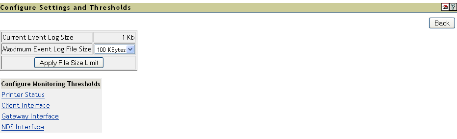 Use the Configure Settings and Thresholds page to modify the default settings for the Print Services Manager Health Monitor. For most print systems, you do not need to change the default settings. This link is accessible only to the administrator of iPrint Manager.