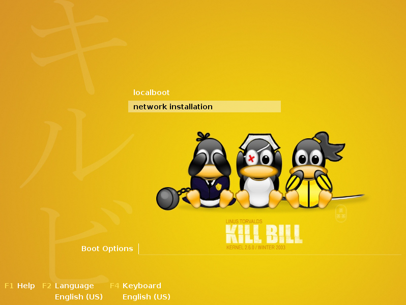 The first level of the menu hierarchy for BIOS systems only provides the selections localboot and network installation. To prevent loops in the installation process localboot is the default selection so that the system being installed will boot from the hard disk when it reaches stage2.