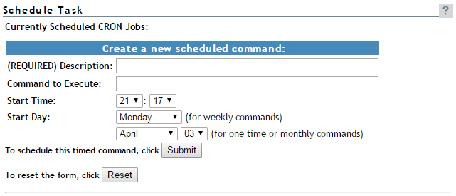 Rather than entering commands on the command line to run a cron job at a specific time, you can use a form on the Schedule Task page to schedule cron jobs—that is, to execute commands or scripts (groups of commands) automatically at a specified time/date—that you want to run at this server. Any cron job is valid.
