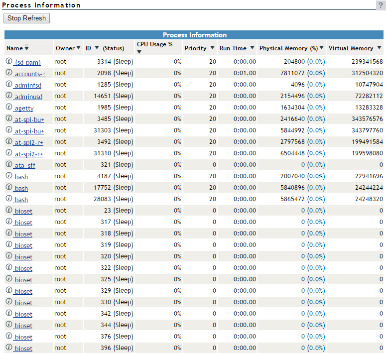 Clicking the View Process Information link in the navigation frame displays the Process Information page. On this page, you can view a list of all the processes as well as their state in the host and perform the actions listed in the following table.