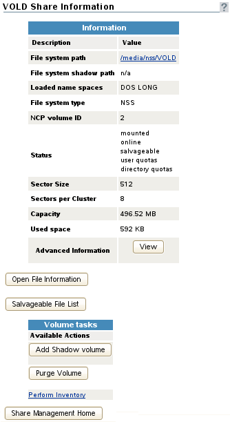 In the Information table, view the following information about the NSS volume: