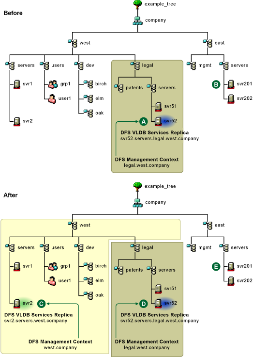 In both of the same-subtree examples, if you delete the lower-level DFS management context (legal.west.company), the VLDB service on its replica server (svr52.servers.legal.west.company) are stopped and its VLDB is deleted. The higher-level management context automatically expands to include the lower-level subtree. A VLDB repair adds the volumes in the subtree to the VLDB. When the repair is completed, junctions that point to volumes in the legal.west.company subtree continue to work normally.