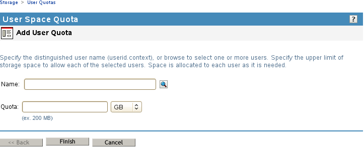 Add user quota: Click New, browse to select the user, specify a quota, then click Finish. The user name appears in the list with the user quota information for the volume.