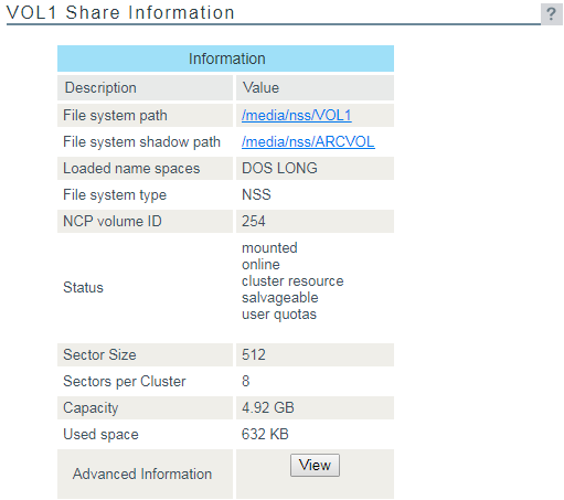 If the volume is not automatically mounted, select Manage NCP Services > Manage Shares to view the Volume Information list, then click the Mount button next to the volume name to mount it.