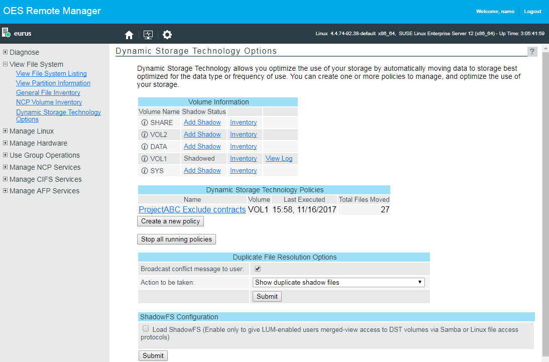 The Dynamic Storage Technology Options plug-in to OES Remote Manager for Linux allows you to create, manage, and remove shadow volume pairs built with OES Storage Services (NSS) volumes. The plug-in is automatically installed in OES Remote Manager when you install NCP Server and Dynamic Storage Technology on your OES server.