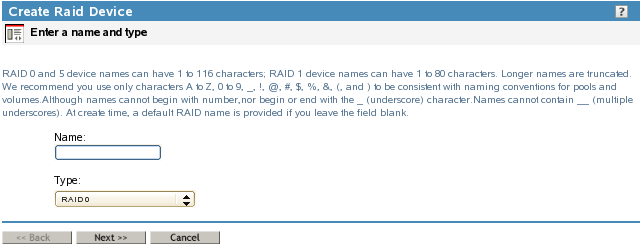 If you leave the Name field blank, NSS creates a unique name for the device in the form of RAID <type> Device <sequential_number>. For information about choosing names, see Section 6.4, Naming NSS Storage Objects.