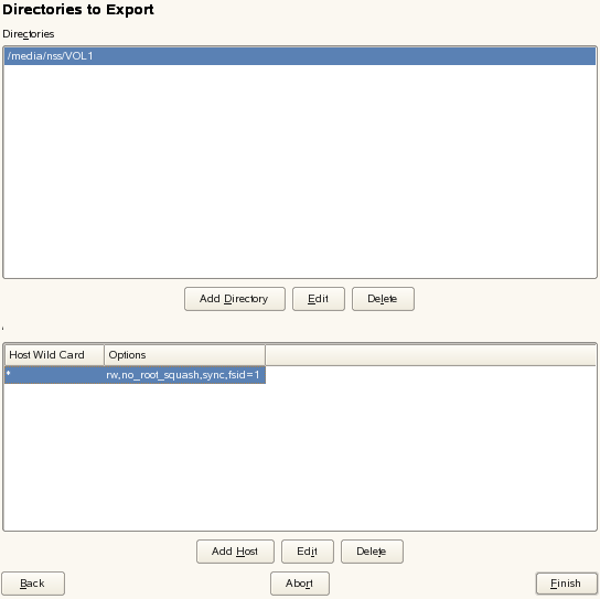 On the Directories to Export page, do the following for each NSS volume on the server that you want to export via NFSv3.