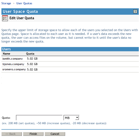 Each of the users you selected now has the new user quota assigned to his or her individual account on this volume.