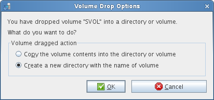 In the Volume Information tab, in the Source Server tree, select volumes or folders that you want to migrate, then drag and drop it in the Target Server tree. The Volume Drop Options dialog-box is displayed. Select Copy the volume contents into the directory or volume option under Volume dragged action and click OK.