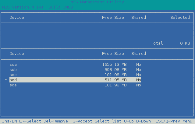 Use the Up-arrow and Down-arrow keys to highlight a device from the list, then press Insert or Enter to select the device. IMPORTANT:NSSMU does not support using Linux software RAID devices and NSS software RAID devices with Linux POSIX file systems. You can use a hardware RAID device to achieve device fault tolerance for Linux POSIX volumes.