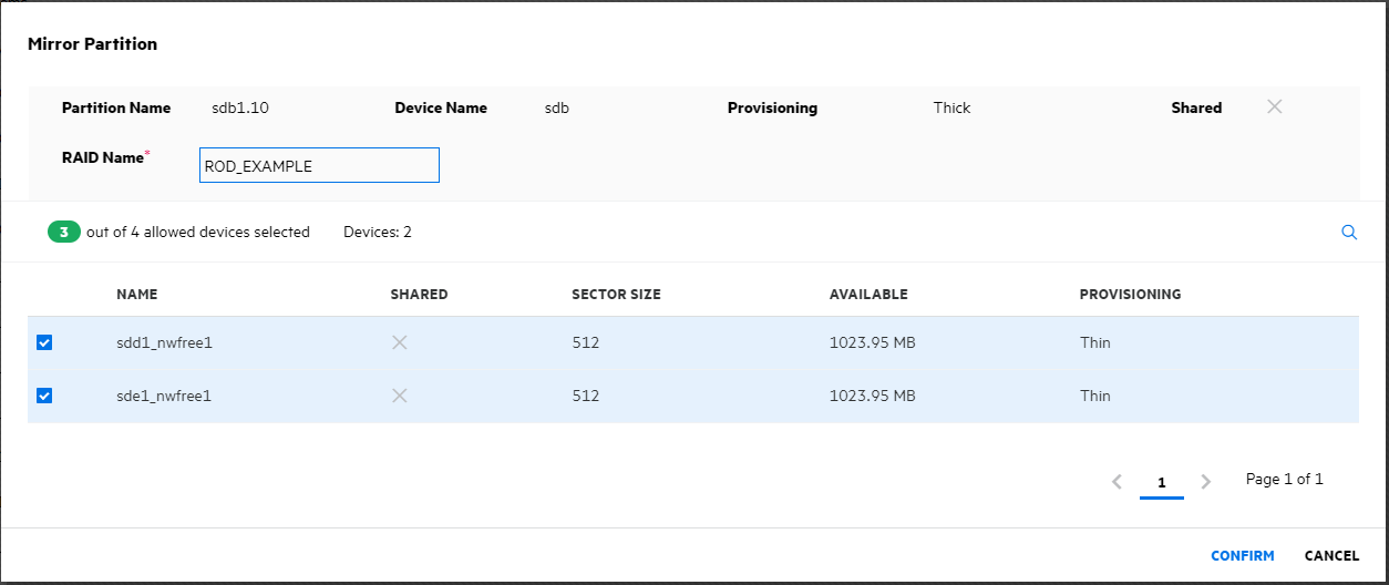 4. Specify the RAID name, select device(s) from the list, and then click CONFIRM.